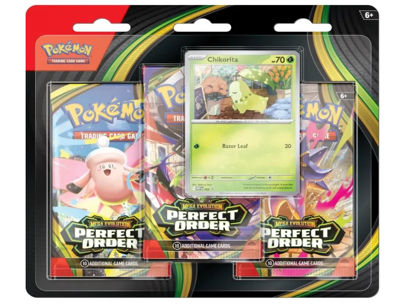 Wzmocnij swoją kolekcję i dołącz do gry dzięki trzem świetnym boosterom z nowego dodatku Pokémon TCG: Mega Evolution - Perfect Order oraz specjalnej, połyskującej karcie promo!