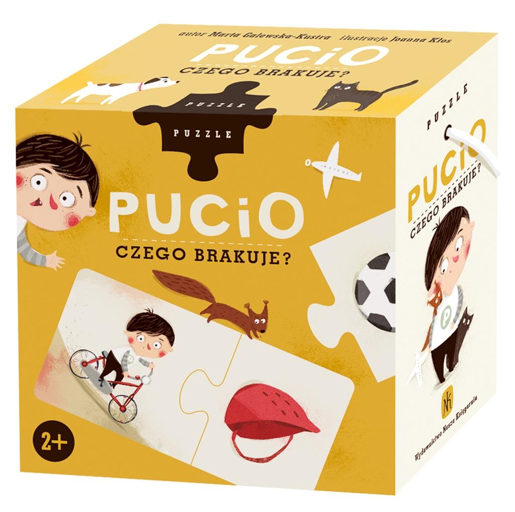 Puzzle dwuelementowe skierowane do dzieci od 2 lat. Na obrazkach jest Pucio w sytuacjach, w których czegoś brakuje. Dziecko powinno przyjrzeć się obrazkowi głównemu, zastanowić się, czego brakuje, i dopasować do obrazka drugi element, na którym widnieje właściwy obiekt.